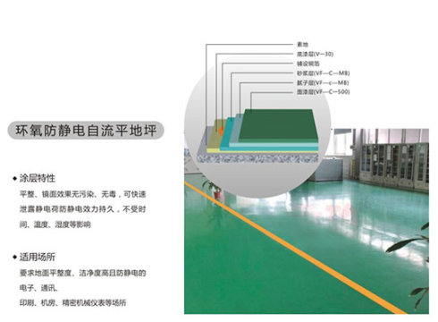 環(huán)氧樹脂防靜電地坪具有表面平整,美觀,整體無縫,易清潔,易維修,防靜電效果長期持久有效,造價低等特點,可廣泛適用于電子電器制造,微機計算機精密設(shè)備,電氣控制,印刷,紡織,軍工等一切需要防靜電或防爆場所的地面涂裝。